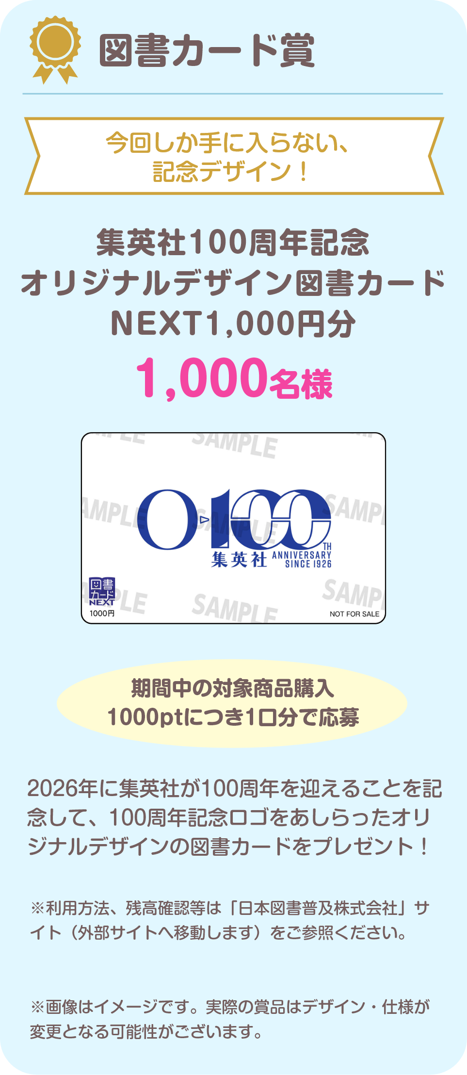「集英社100周年記念 オリジナルデザイン図書カードNEXT」については、「日本図書普及株式会社」サイトをご参照ください。 https://www.toshocard.com/guideline/contact.html